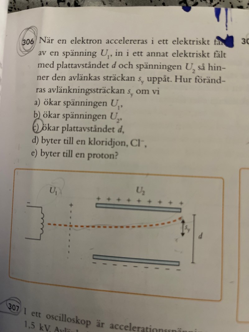 Jag undrar ifall det är rätt att tänka så här i c. Vi har formeln E=U/d , om d ökar så minskar U. Att U (spänningen emellan plattorna) minskar betyder att elektronen får en lägre acceleration inuti fältet, detta innebär i sin tur att att avlänknings sträckan kommer vara ”mindre”, dvs sy minskar