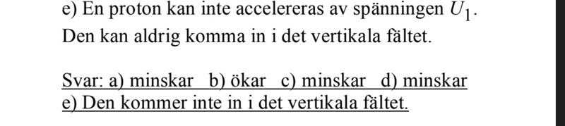 Facit i till e säger att en proton inte accelereras av spänningen U1. Den kan aldrig komma in i det vertikala fältet.