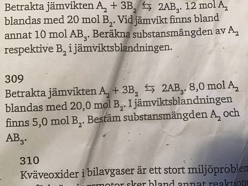 För jag antar man räknar ut A2 genom att balansera det med 3. För att det ska bli jämnvikt då kommer A2 =3 mol. Men jag tänker då på AB3 då försökte kanske sätta B2<=> AB3 men kommer inte riktigt någonstans