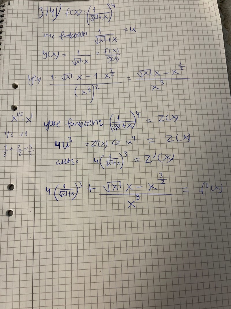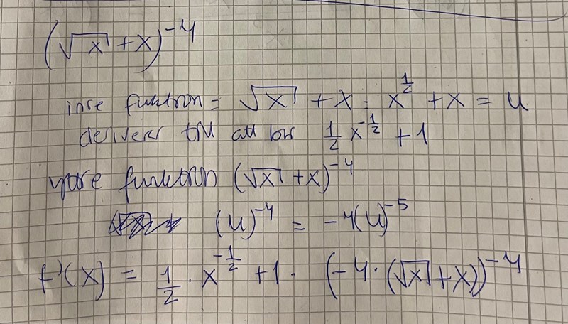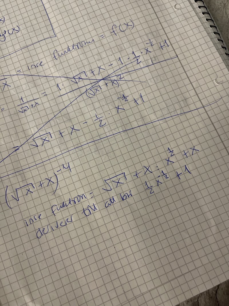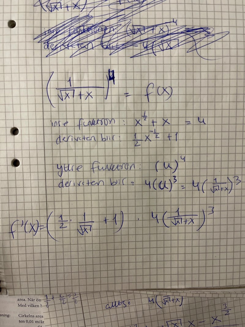 Samma fel. Och ett nytt i första parentesen. roten ur x + x ska stå i nämnaren (men typ följdfel från potensens teckenfel).