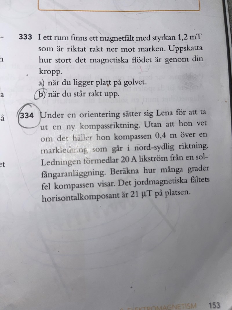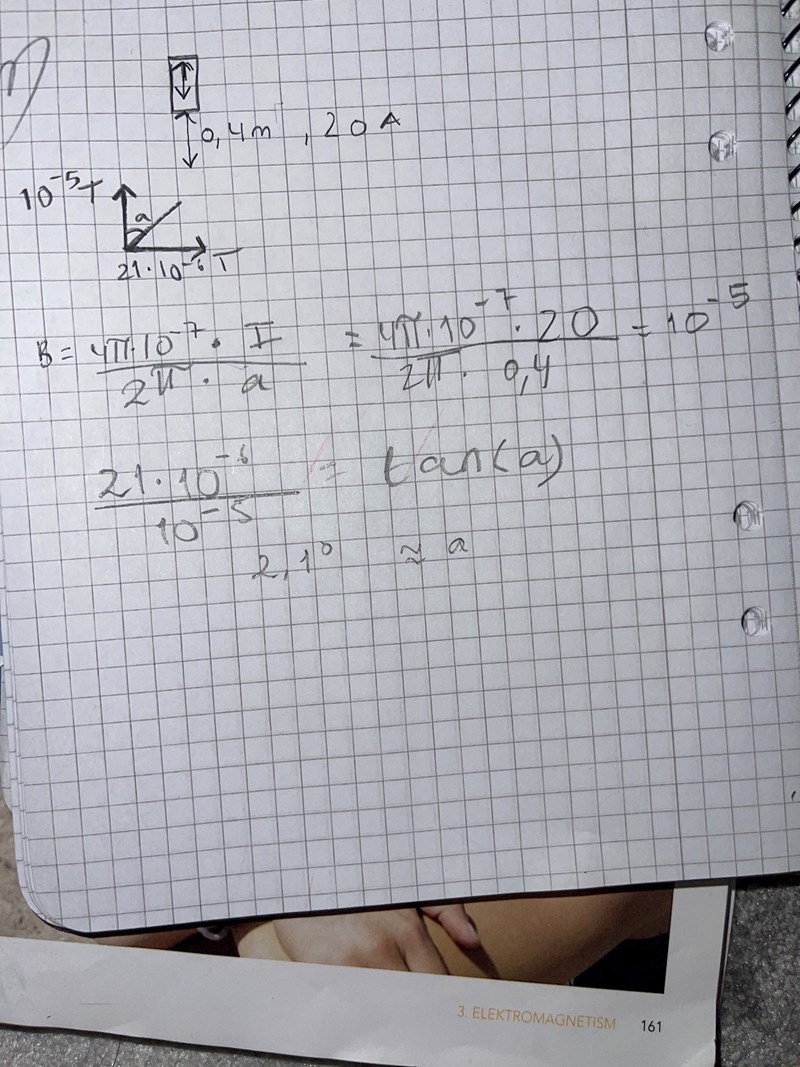 där a är vinkeln mellan norr och kompassnålen (nålen kommer att ställa in sig enligt det totala fältet som den känner av). Nu visste vi inte åt vilket håll strömmen genom ledaren gick så det kan hända att Bl inte pekar åt öster som i min figur. I så fall pekar den åt väster och missvisningen kommer att bli lika stor men riktad snett uppåt vänster i figuren istället.