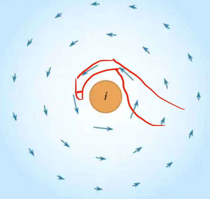 Vi ritar det ofta som en cirkel med en pil men för att förstå fältriktningen i en punkt måsta man veta att fältet inte är en "cirkel" utan har olika riktning överallt runt ledaren. Högerhandsregelns fingertoppar visar riktningen i den punkten där de hamnar när du greppar ledaren. Om du vrider handen runt medans du greppar ledaren kommer fingertopparna att peka i tangentens riktning från en cirkel. Det är den cirkeln vi brukar rita.