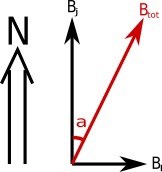 Horisontalkomposanten av magnetfältet från jorden kan vi kalla Bj och magnetfältet från ledaren kan vi kalla Bl. Norrriktningen är den riktningsom Bj pekar. Vi får då figuren:
