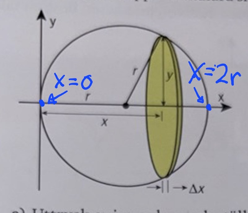 Eftersom vi integrerar volymbidraget från de gröna skivorna så ska undre gränsen vara x = 0 och den övre gränsen vara x = 2r.