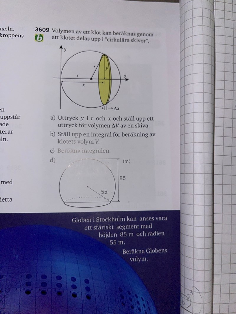 c-uppgiften handlar inte om Globen. Där finns inga mätvärden. Du ska helt enkelt beräkna den integral du ställt upp i b-uppgiften. Svaret ska bli lika med volymen av ett klot med radien r. Jämför med din formelsamling för att se om ditt svar blir rätt.