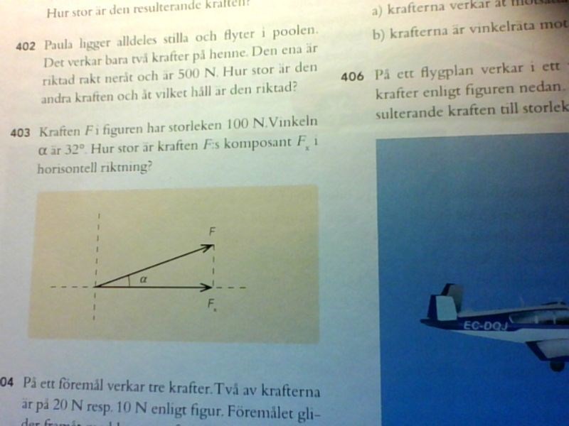 Har lite problem med 403. Jag tänkte att man ska räkna ut Fx genom cosinus på vinkel a. Men det blir 83 vilket enligt facit inte är rätt. Har jag tänkt fel är det facit som är fel?