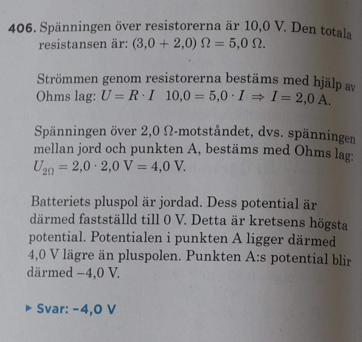 2. Potentialen i punkten A beräknas enligt lösningen genom att ta reda på spänningen över 2ohms resistorn. Varför kan det inte lika gärna vara över 3ohms resistorn?