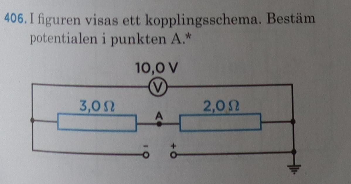 2. Om man inte har en känd nollpunkt så får man ange en, och då kan man lika gärna säga att pluspolen är noll som att minuspolen är det, och i det senare fallet är det 3 ohmsmotståndet man mäter över. Men nu står det att pluspolen är jordad så det är spänningen mellan A och pluspolen som söks.