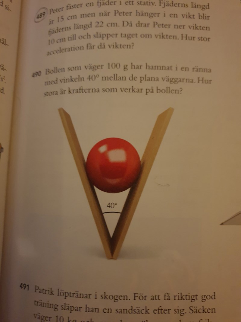 Facit: "Tyngden är 0.98 N och normalkrafterna från väggarna är 1.4 N"