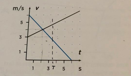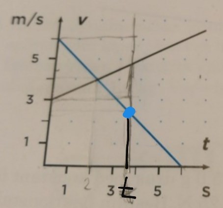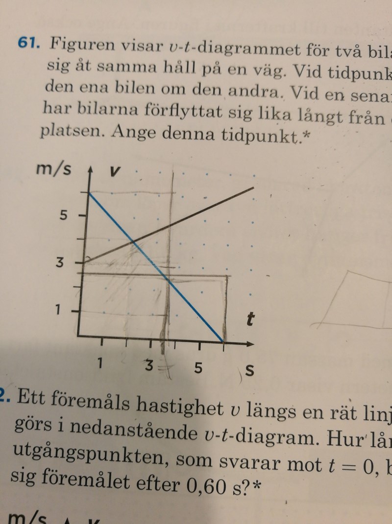 På bilden ser jag att svarta bilen och blåa bilen har samma tid vid tiden 2 s och kör i samma sträcka. Men jag ser ej var bilarna har förflyttat sig lika långt