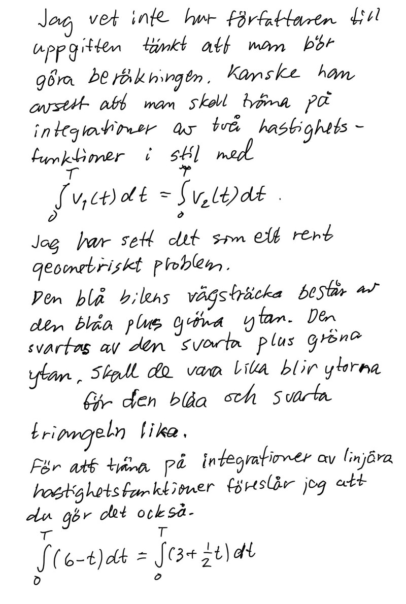 De frågar när bilarna har kört lika långt, vilket du alltså kan ta reda på genom att bestämma vid vilken tidpunkt t areorna under graferna är lika stora.
