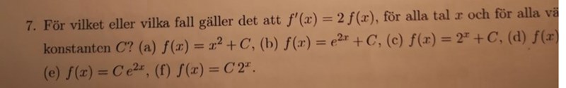 för funktionen f(x) = 2e^x gäller att f’(x) = f(x)