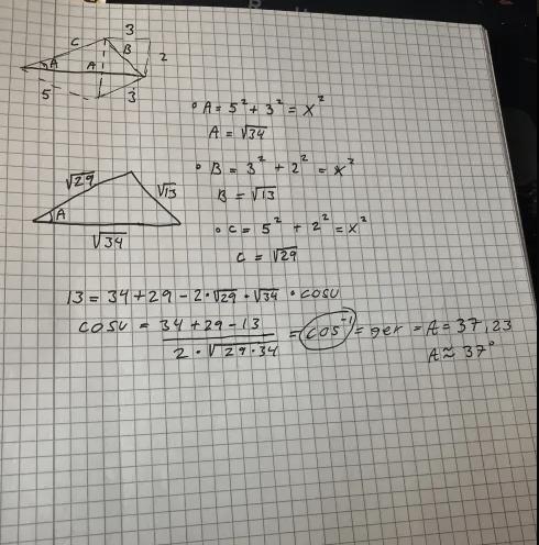 Atr använda cosinussatsen som du har gjort verkar vara en bra idé. Men det är svårt att följa ditt resonemang när du inte skriver någon förklarande text.