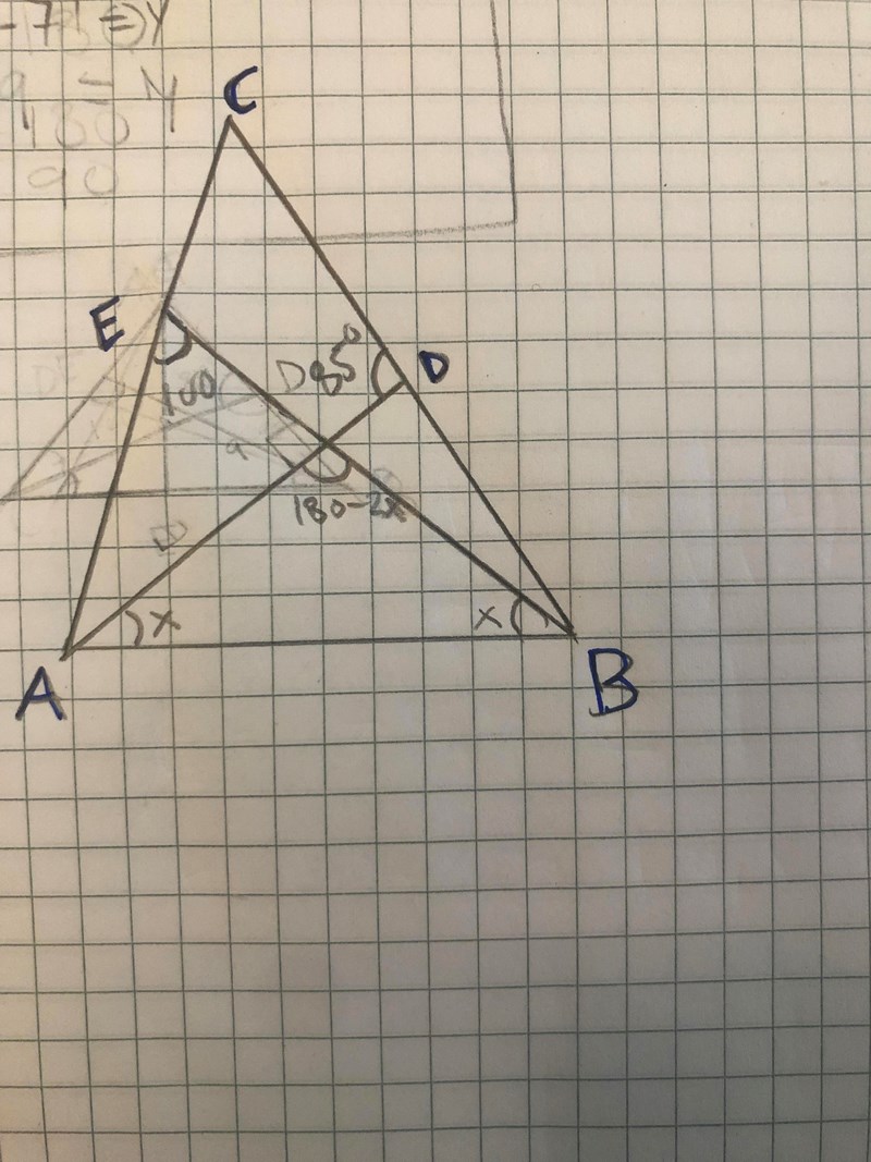 Kalla vinkeln BAD x och vinkeln ABE y som Marie51 föreslår. Med de beteckningar du har nu så stämmer inte vinkelsumman blir inte 180.