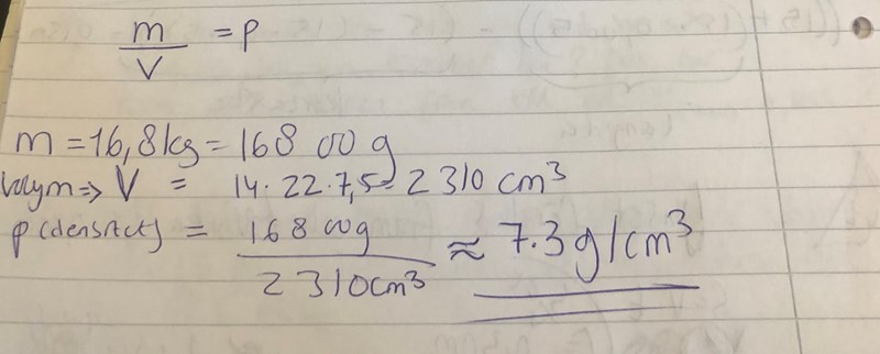 Uppgift: En tacka av gjutjärn har måtten 7,5 cm x 14,0 cm x 22,0 cm och väger 16,8 kg. Beräkna densiteten för gjutjärn.