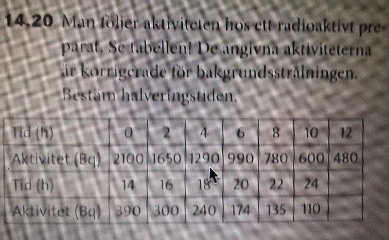 I denna uppgift får jag svaret 5,6 h men enligt facit är svaret 5,5 h. Jag förstår dock inte hur man ska få det. Jag löste uppgiften genom att skriva in alla värden på en grafräknaren och därefter läsa av hur lång tid som hade gått då aktiviteten var hälften av den ursprungliga aktiviteten (motsvarande a värdet i funktionen). Funktionen jag använde var: 2104,11*0,8841521^x