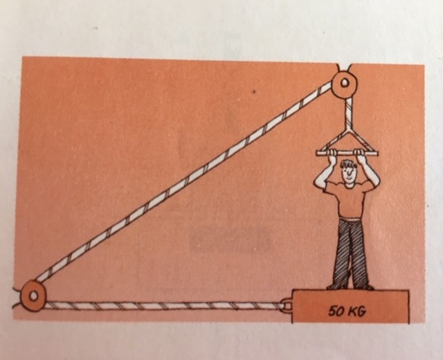 En låda med massan 50 kg placeras på ett horisontellt underlag. En person som väger 70 kg ställer sig på lådan. Han drar nedåt i en lina som löper över en trissa som bilden nedan visar. Hur stor kraft måste han dra med för att lådan ska rubbas? Friktionstalet mellan låda och underlag är 0.20.