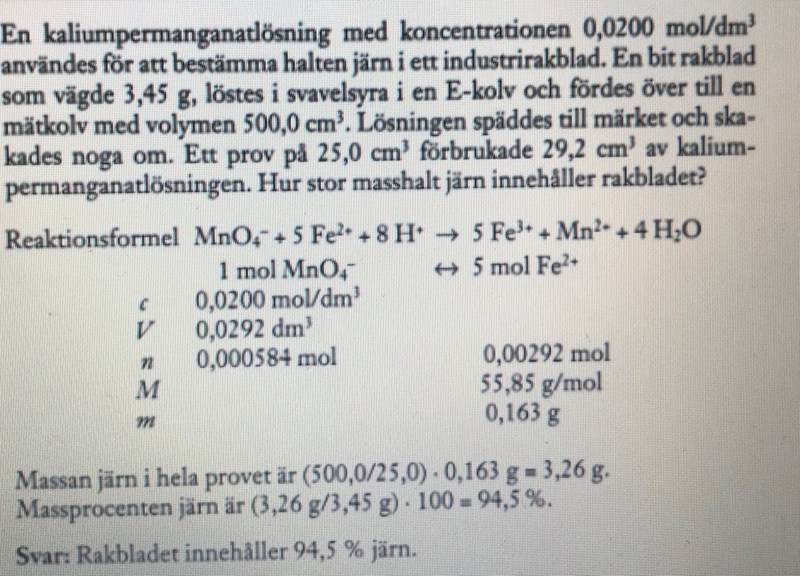 Det du ska räkna ut är hur många joner Fe2+ som har omvandlats till Fe3+. Sedan kan du använda det för att räkna ut massan järn. Du ska alltså börja med mängden kaliumpermanganat och sedan använder du det för att räkna ut hur mycket järn som omvandlades från Fe2+ till Fe3+.