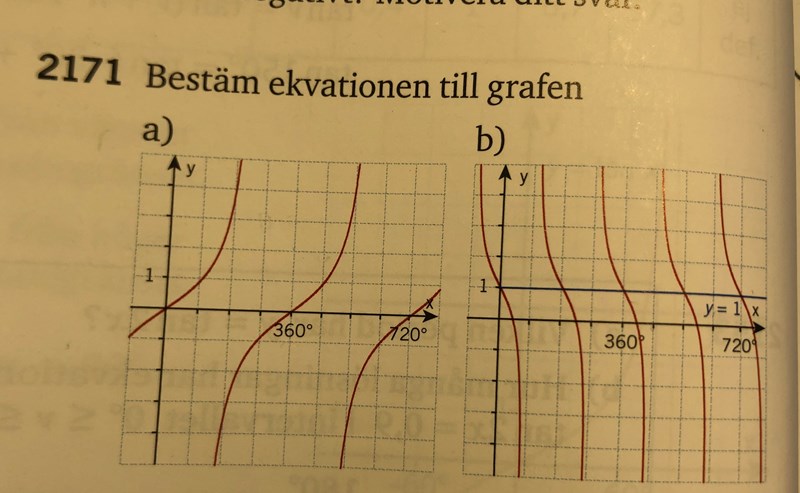 Jag förstår inte riktigt hur man ska tänka kring dessa uppgifter. I uppgift a exempelvis borde man väl utgå från Y=tanx men hur ska man i b exempelvis få fram att den är vänd åt andra hållet? I a tänker jag att perioden är 360 blir det då Y=tanx men hur gör man i b?
