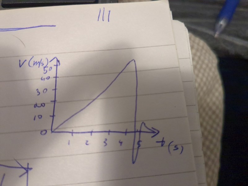 Jag har hittat tid(≈4,7) och hastighet som det når i slutet (≈47,1 s/m). Tyngsacceleration tog jag 10. Men har jag skissat diagram på rätt sätt? I början når det max hastighet(när hoppet är nästan slut) och sen bungyjump stoppar det och då finns det moment när det får negativ hastighet av tryck, men snart blir det stabil noll.