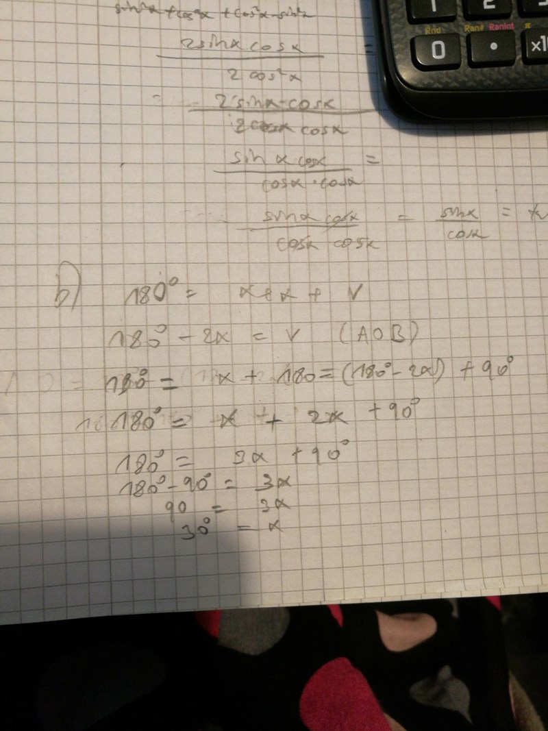 Smaragdalena skrev:Kan du förklara steg för steg vad det är du gör? Första raden är vinkelsumman för en triangel, andra raden är ett uttryck för den tredje vinkeln v = 180o-2x. Så långt hänger jag med, men vad är det du gör på nästa rad?