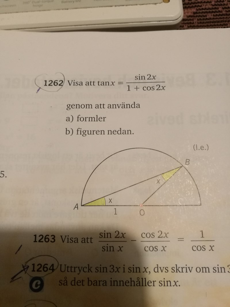 Pröva nu att tänka kring vad tan(x), cos(2x) och sin(2x) motsvarar i figuren, givet att du vet att ovan nämnda vinkel är 2x.