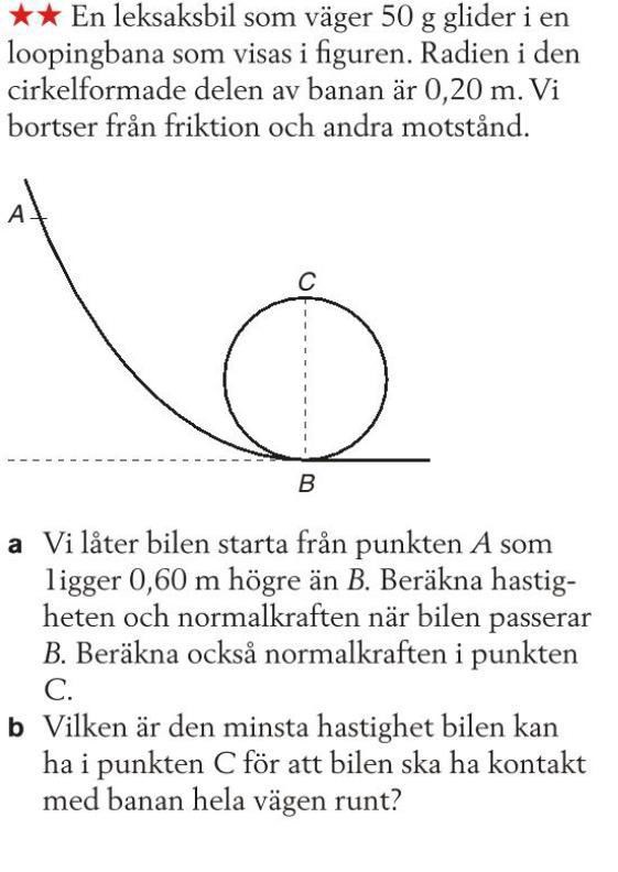 b) varför är det minsta värde på normalkraften=0? förlorar bilen inte kontakt med banan då?