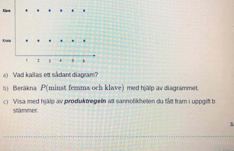 Jaha, alltså sannolikheten att få minst en femma är 2/6 eftersom det finns 2 möjliga av 6 st totalt. I en krona finns 2 sidor. Antingen en krona eller klave. Dvs är sannolikheten 1/2 att för klave.