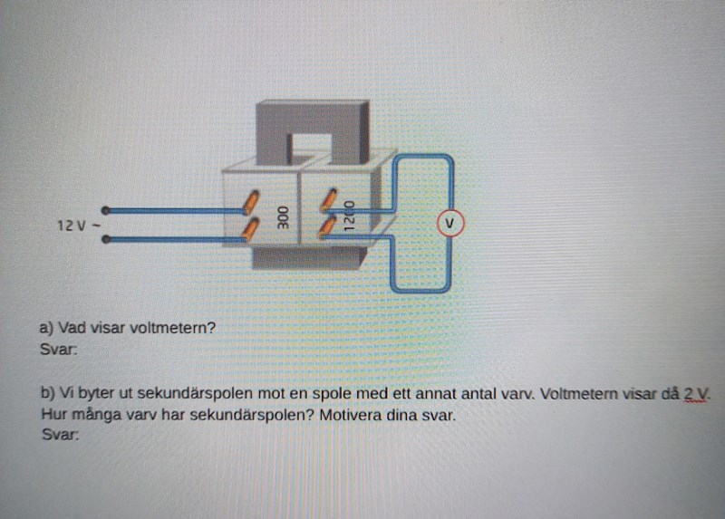 På liknande sätt som du räknade ut a-uppgiften. Där räknade vi ut utspänningen från sekundärspolen genom att vi visste inspänningen och antalet varv på primär och sekundärspolarna.