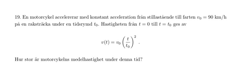 Någongting är skumt med frågan. Om en motorcykel accelererar med konstant acceleration från 0 till 90 km/h så är medelhastigheten 45 km/h. Uttrycket i mitten stämmer inte med uppgiftstexten.