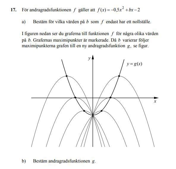 Sharity skrev:Jag ska snart göra ett större prov i matte 2b och håller på att övar genom att gå igenom gamla nationella prov. Jag fastnade på b) på den här uppgiften och vet inte hur jag ska göra, eller ens var jag ska börja. Tacksam för hjälp!