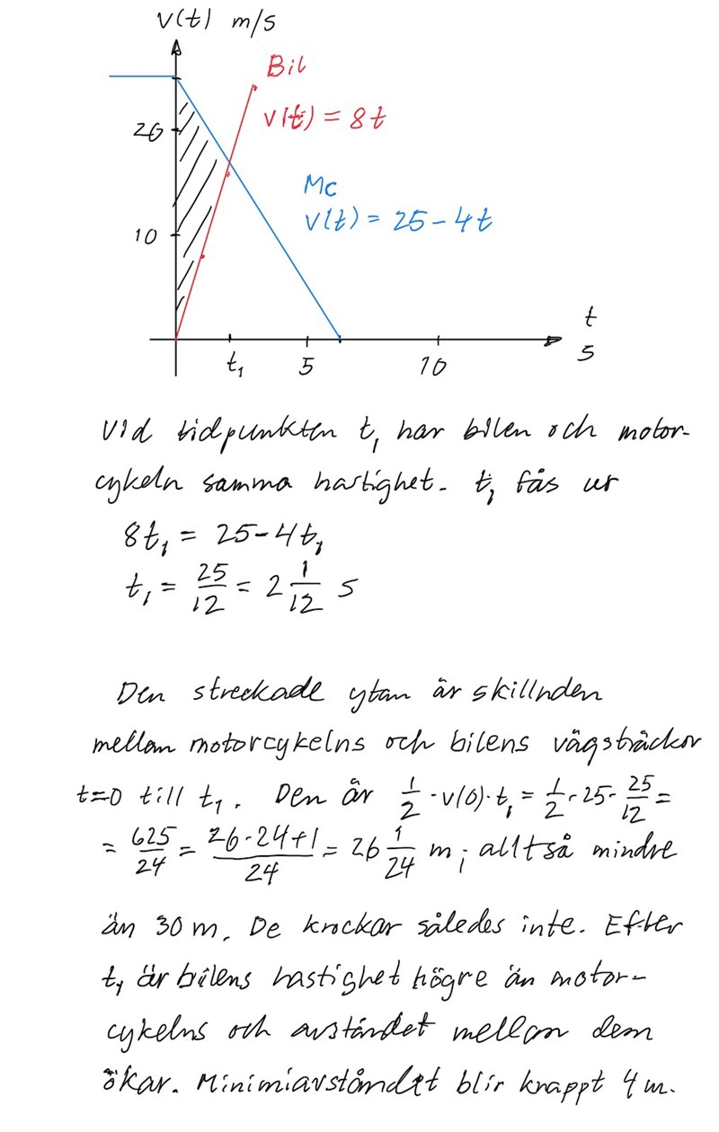 "Anders är ute och kör motorcykel med hastigheten 90 km/h. Plötsligt får han syn på en stillastående bil 30 m framför sig. Han börjar bromsa med retardationen 4 m/s^2. Samtidigt startar bilen och accelererar med 8 m/s^2 bort från Anders.