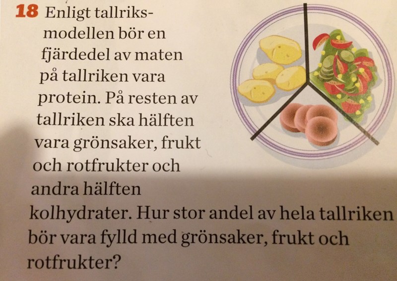 Smaragdalena skrev:Det som är kvar när man har tagit bort den fjärdedelen som är protein är 3/4. Hälften av detta är grönsaker, frukt och rotfrukter. Hur stor del av hela tallriken är grönsaker, frukt och rotfrukter?