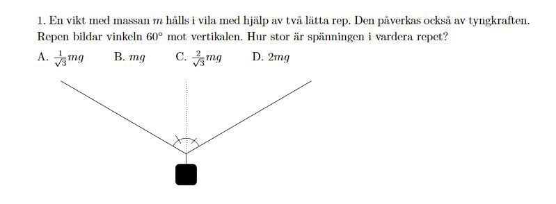 Jan Ragnar skrev:Viktens tyngdkraft är F = mg, och alla alternativen innehåller ju mg multiplicerat med olika faktorer.