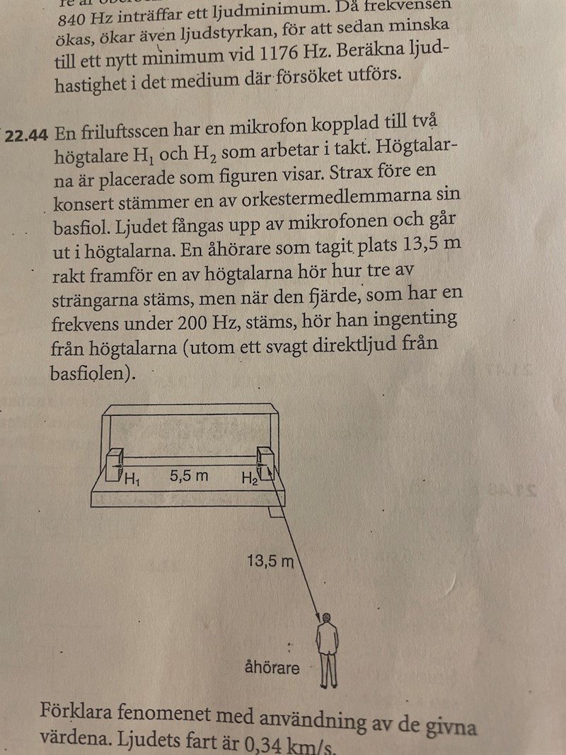 Jag tolkar det som att de vill att du förklarar hur interferens mellan ljud från de två högtalarna kan orsaka det som beskrivs i uppgiften, som du skrev, han sitter i ett minimum vid en viss våglängd.