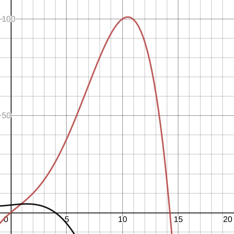 Rita upp grafen och låt räknaren ta fram max resp min för funktionen, vilket ger svaret om tidpunkten för det största extremvärdet