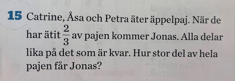 Jag har alltså delat tredjedelen som finns kvar på fyra personer, men jag vet inte om mitt svar, att Jonas får 1/12, gäller för hela pajen eller bara för den tredjedelen?
