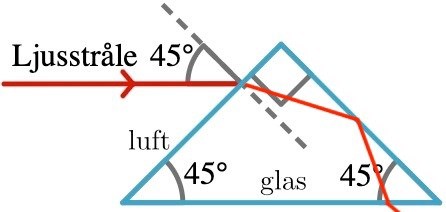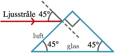 I ett triangulärt glasprisma är vinklarna 45∘,45∘ och 90∘. En ljusstråle infaller mot prismat som figuren visar. Då ljusstrålen lämnar prismat har den fått en annan riktning.