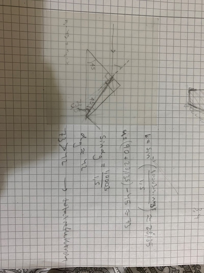 Innan träffade den prisman med riktningsvinkeln 45 grader och sedan lämnade den prisman med 73,135 grader. Är det 73-45?