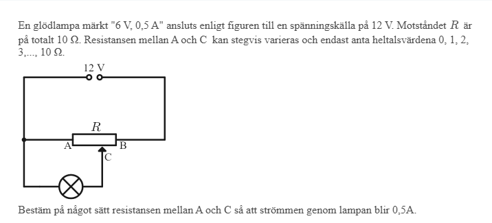 Dela upp resistansen R i två seriekopplade resistanser R1 och R2. Ledaren från lampan ska kopplas mellan resistanserna. Samtidigt får du veta att R1 och R2 är heltal och summan är 10. Beräkna strömmen genom lampan. Testa ett par olika värden så att du får 0,5A genom lampan.