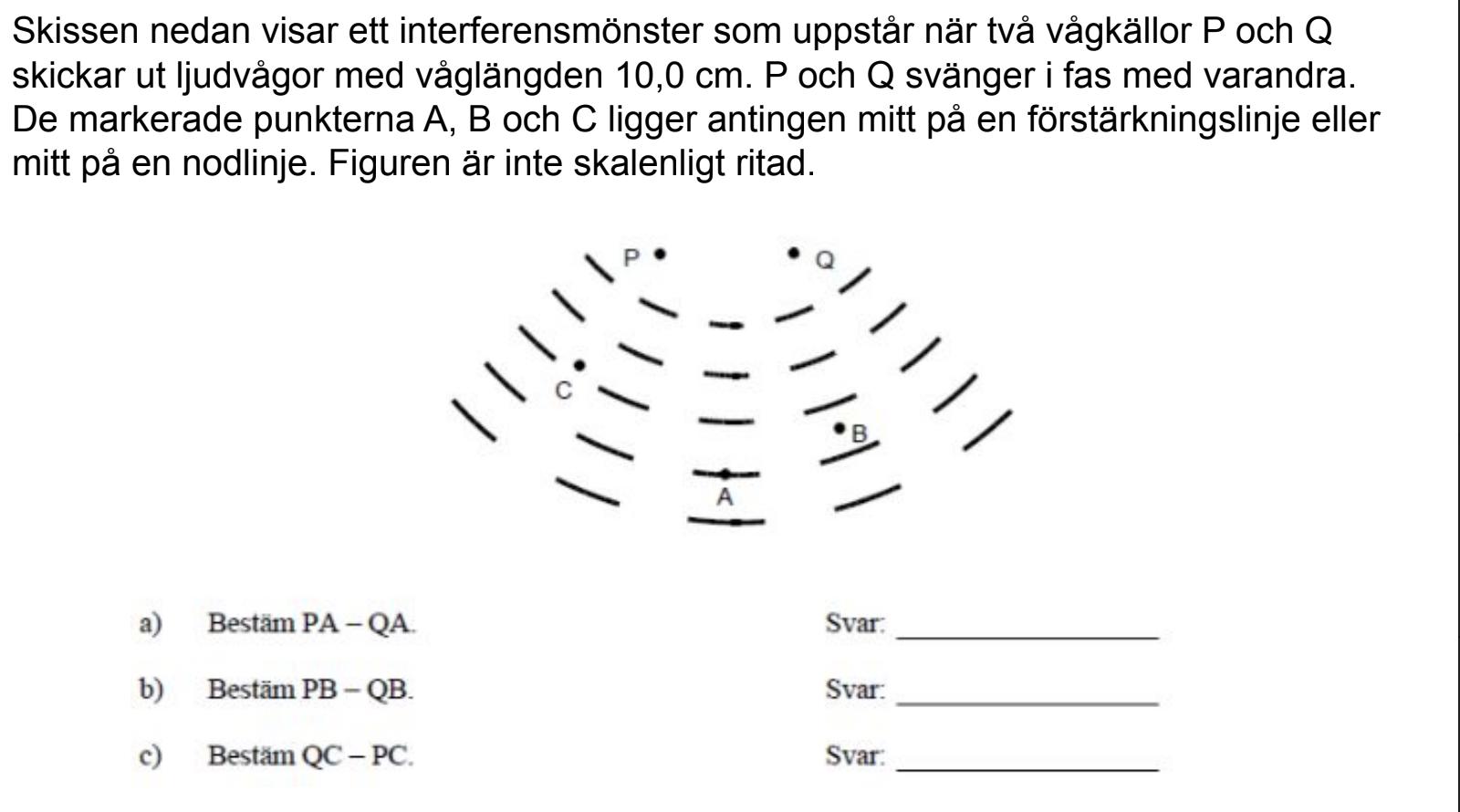 Hej! Jag har suttit och funderat över vad jag ska göra med denna uppgiften. Jag förstår att a) blir 0. Men sedan efter det har jag försökt lösa dem andra och blivit lite förvirrad. Jag förstår våglängdsprincipen, men hur jag ska kunna applicera det med denna uppgiften har jag lite svårt att förstå.