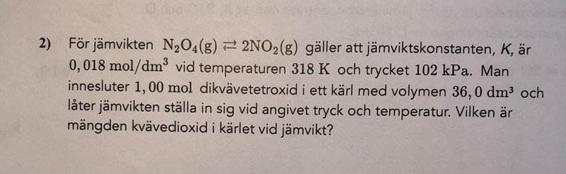 Om man antar att x är antalet mol blir det (1-x)/36 som är N2O4 koncentrationen och 2x/36 som är koncentrationen av NO2. Men borde man inte lika väl kunna sätta x som koncentrationsförändringen och då få: (2x)^2/(1/36 -x)=0,018?