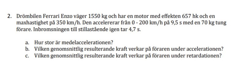 Vad behöver du hjälp med på b (om vi tar den först)? Du vet accelerationen, du vet förarens massa, du vill veta kraften. Vilken formel skall du använda?