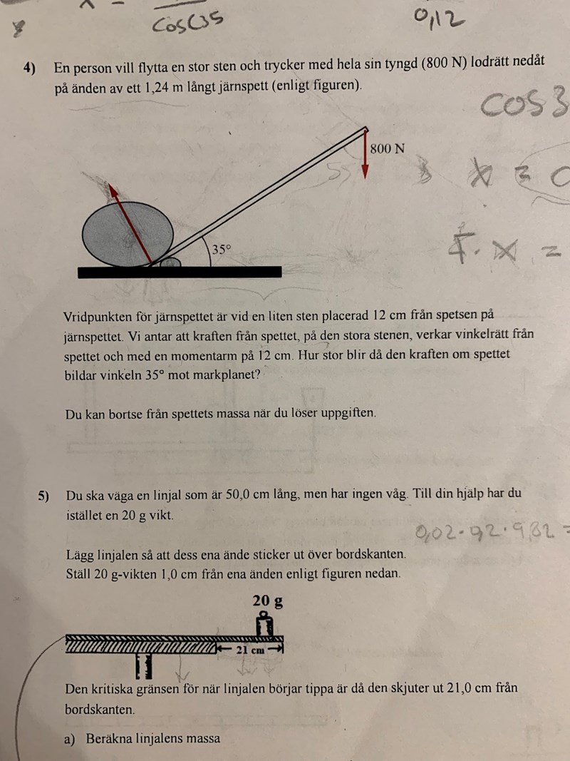 Tack för svaret. Men är inte 0,12 avståndet horisontellt, för det stod avståndet mellan den lilla stenen och spetsen, det var därför jag räknade ut det snedda avståndet till 0,12/cos(35)? Eller har jag missuppfattat och 0,12 är det snedda avståndet? Med snedda avstånd menar jag alltså avståndet längs järnspettet.