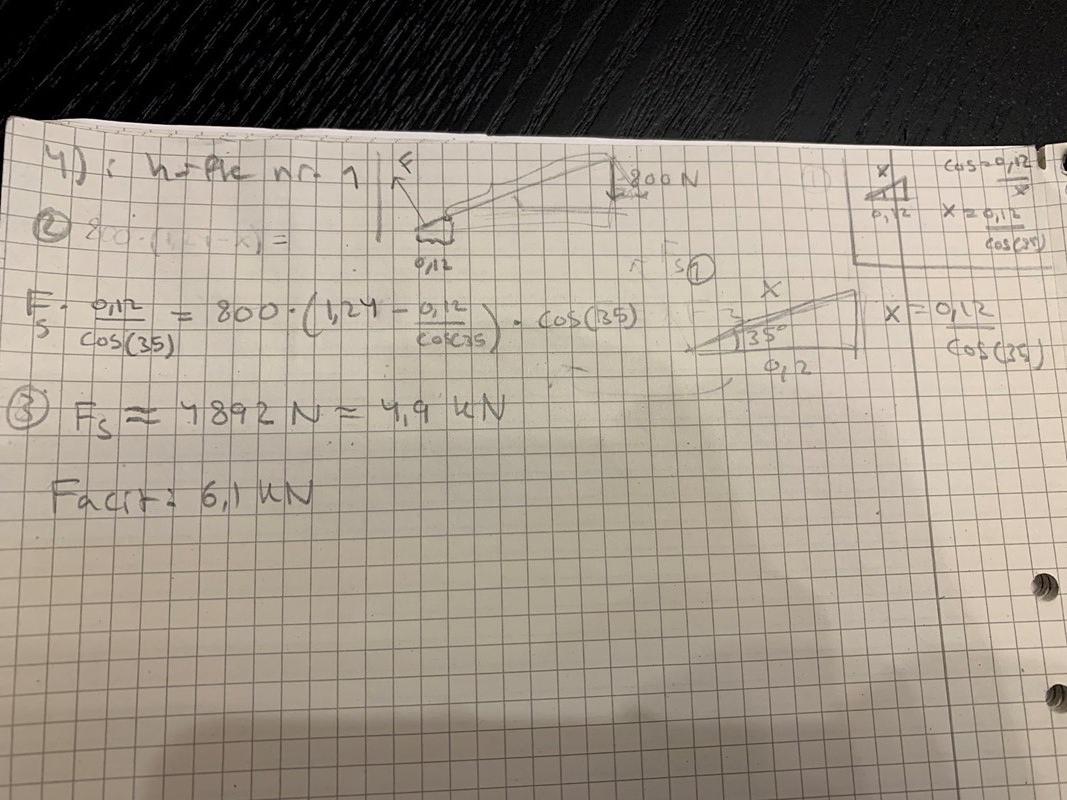 x*0,12 = 800*cos(35)*(1,24-0,12) => x = 6,12 kN avrundas till 6,1