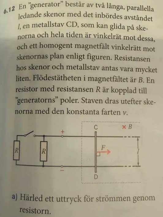 Hej!! Har en fråga om a), lösa uppgiften genom att använda formeln F = B * i * l, som jag gjorde om till I=F/Bi, verkar dock inte vara rätt enligt facit. Verkan som att man istället ska använda e=Bvl. Är min lösning fel? Får jag inte använda F eftersom den inte anges i uppgiften men bara i bilden eller är det något annat?