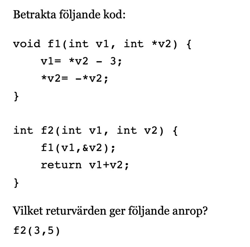 Jag håller med uppgiften som finns bifogad nedan. Jag fattar dock inte alls hur jag ska tänka och blir sjukt förvirrad av pekaren och adress-operatorn . Enligt facit ska anropet retunera värdet -2. Skulle verkligen uppskatta om någon kan förklara vad det är som händer!