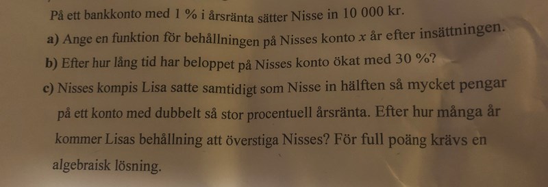 När Lisas konto går om Nisses kommer funktionerna ha samma värde. Alltså kan du sätta dina två funktioner lika med varandra, och lösa ekvationen :)