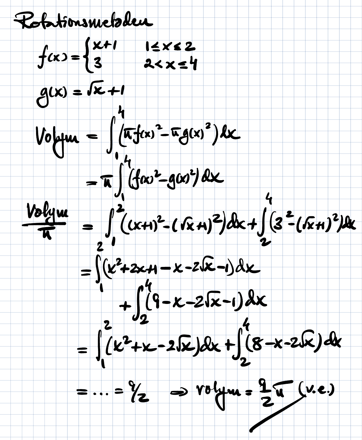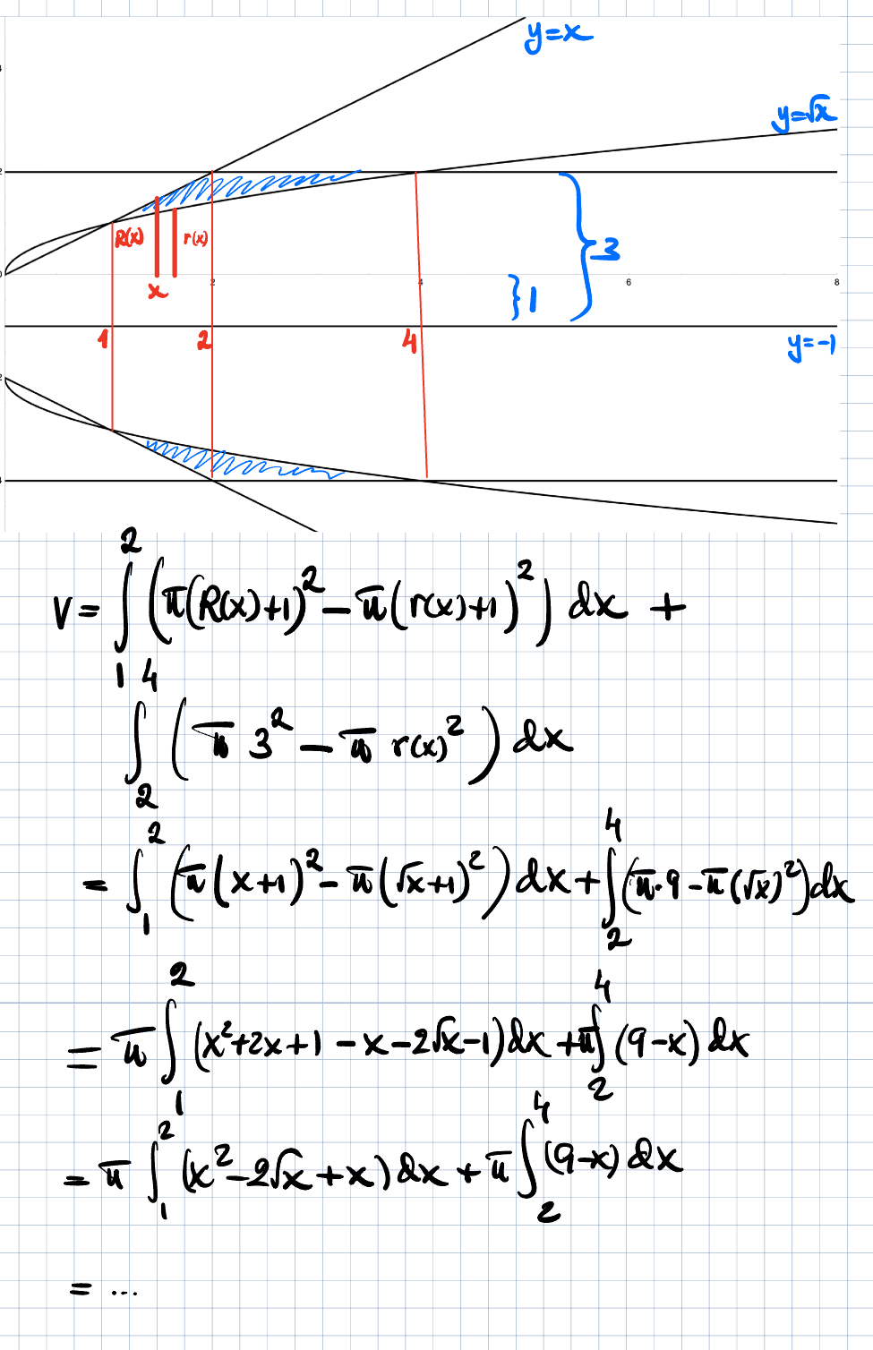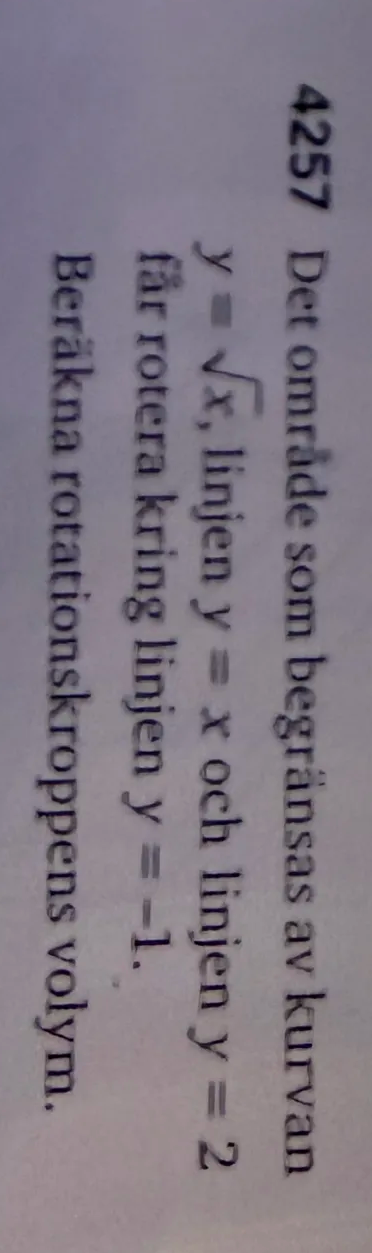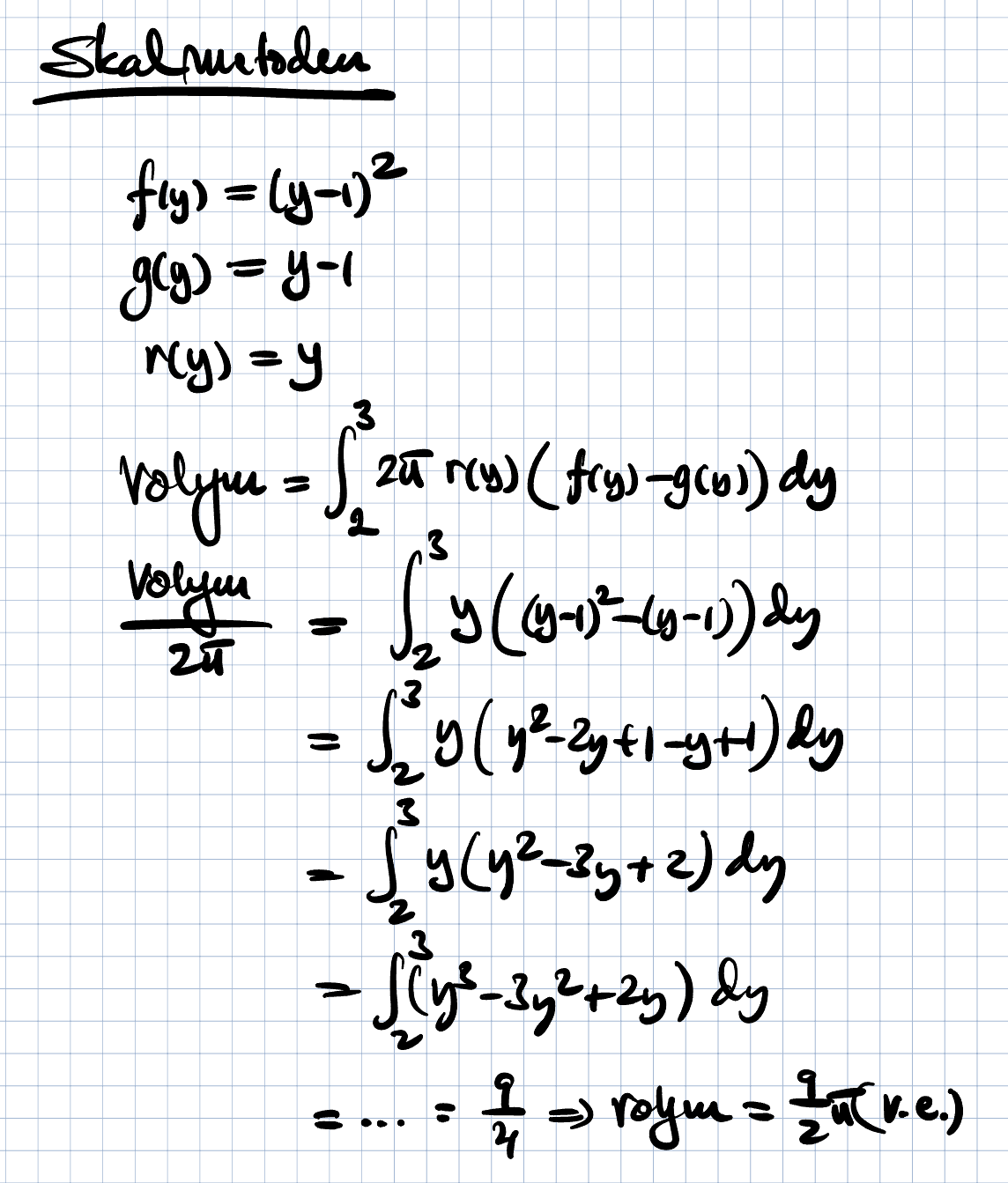Hej! Har en uppgift där jag ska lösa vad rotationsvolymen blir när arean som är omringad av de tre funktionerna roterar kring x-axeln. Försöker använda skalmetoden men kommer inte fram till det rätta svaret av 14,1. Får fram uttrycket i nedre bilden men blir inte rätt :(