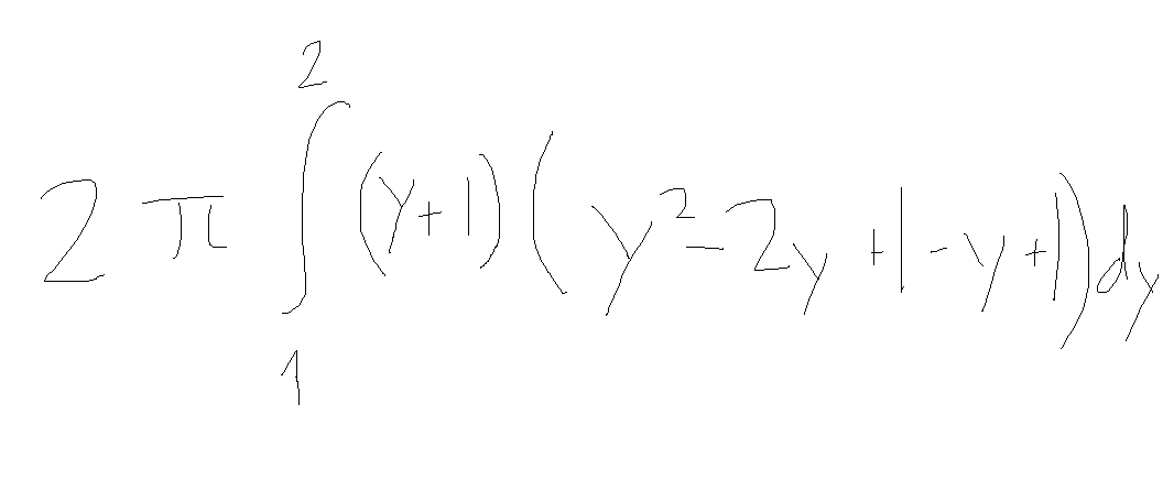 V=2π12y2-yy+1dy=9π2\displaystyle V=2\pi\int_{1}^{2}\left(y^2-y\right)\left(y+1\right)dy=\frac{9\pi}{2}